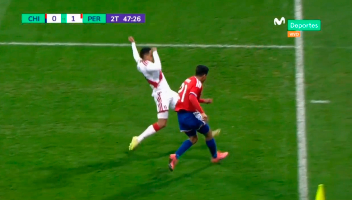Minuto 47: el lateral izquierdo, que es uno de los mejores de la Bicolor, cortó de gran manera el centro chileno. Foto: Movistar Deportes.