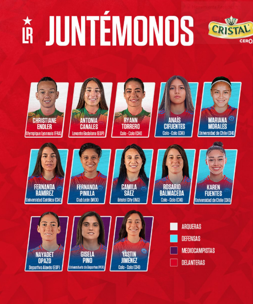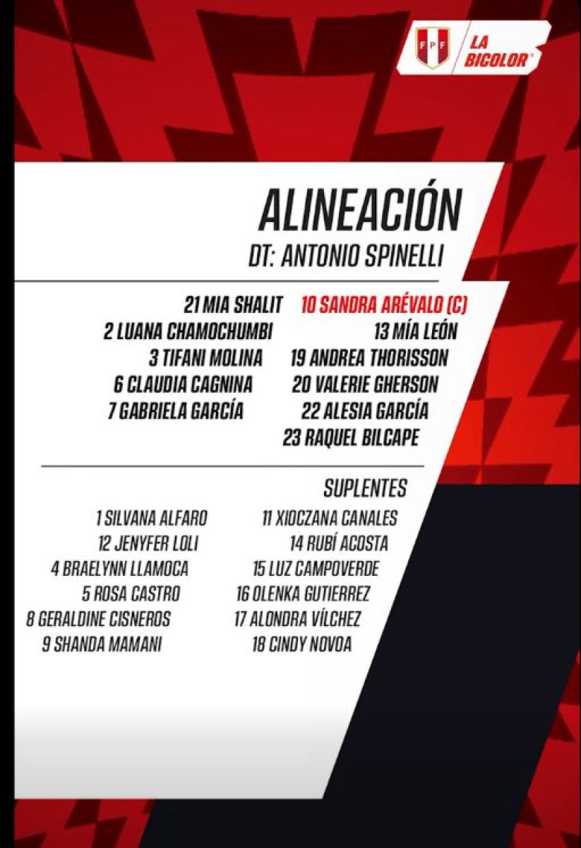 - Arqueras: Jenyfer Loli (Alianza Lima), Silvana Alfaro (Universitario de Deportes) y Mía Shalit (Hapoel Jerusalem - Israel).