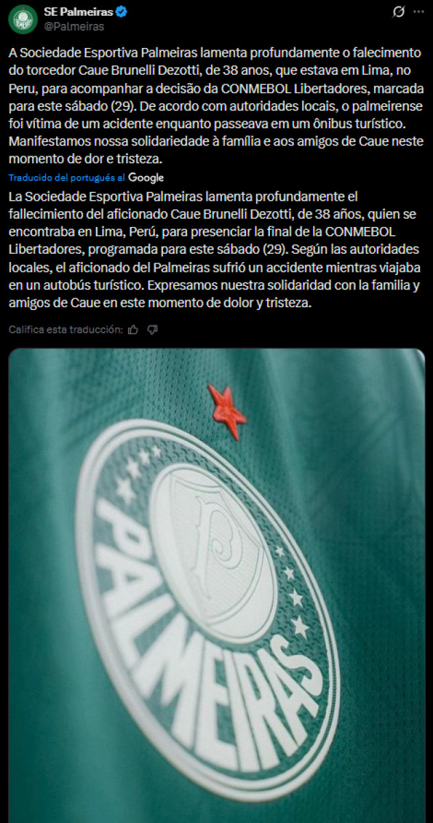 A través de redes sociales, el Verdao lamentó la trágica muerte de uno sus hinchas en las calles de Lima. "La Sociedade Esportiva Palmeiras lamenta profundamente el fallecimiento del aficionado Caue Brunelli Dezotti, de 38 años, quien se encontraba en Lima, Perú, para presenciar la final de la Conmebol Libertadores, programada para este sábado (29). Según las autoridades locales, el aficionado del Palmeiras sufrió un accidente mientras viajaba en un autobús turístico. Expresamos nuestra solidaridad con la familia y amigos de Caue en este momento de dolor y tristeza", escribieron en X.