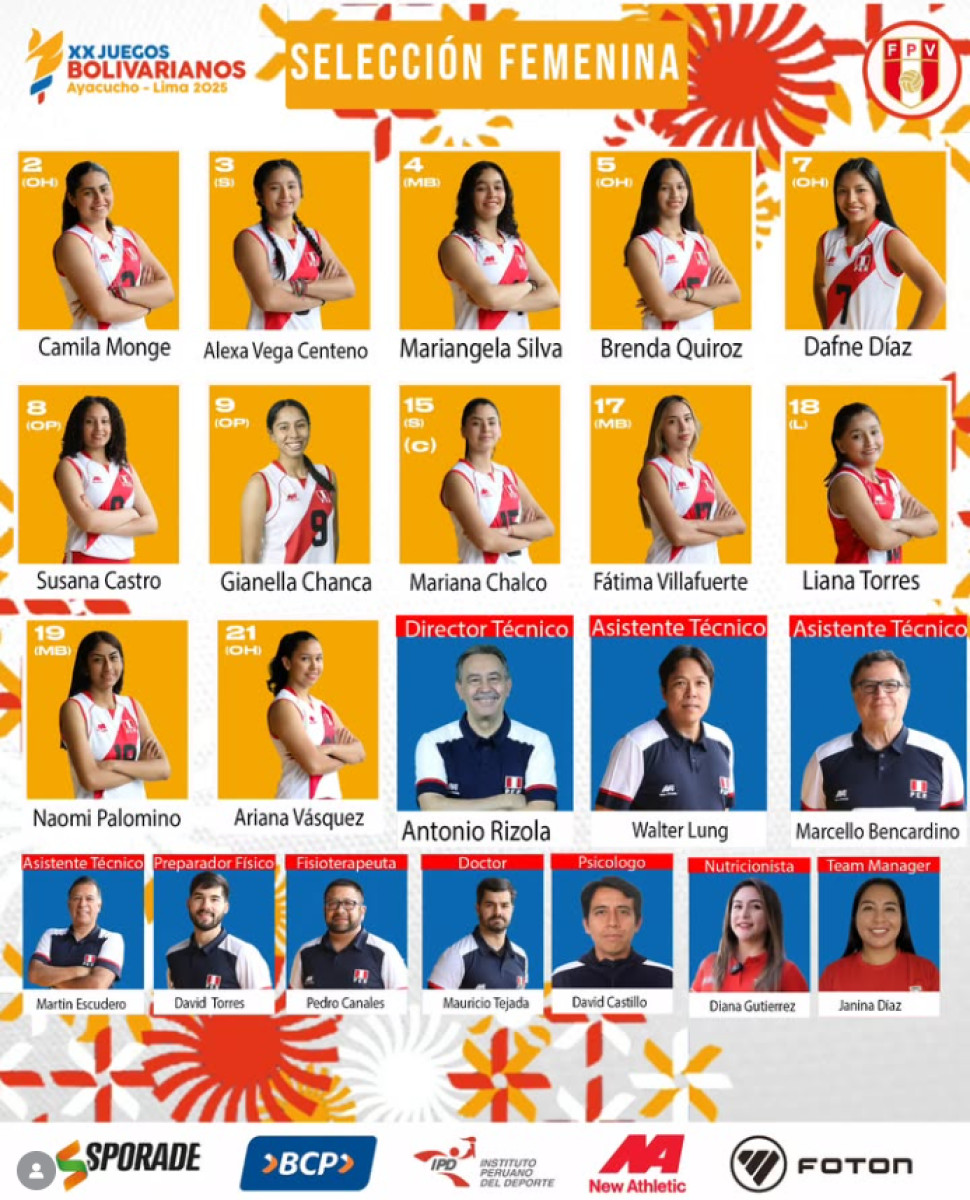 Estas son las 24 jugadoras que fueron elegidas por Antonio Rizola para representar a Perú en la presente edición de los Juegos Bolivarianos 2025.
