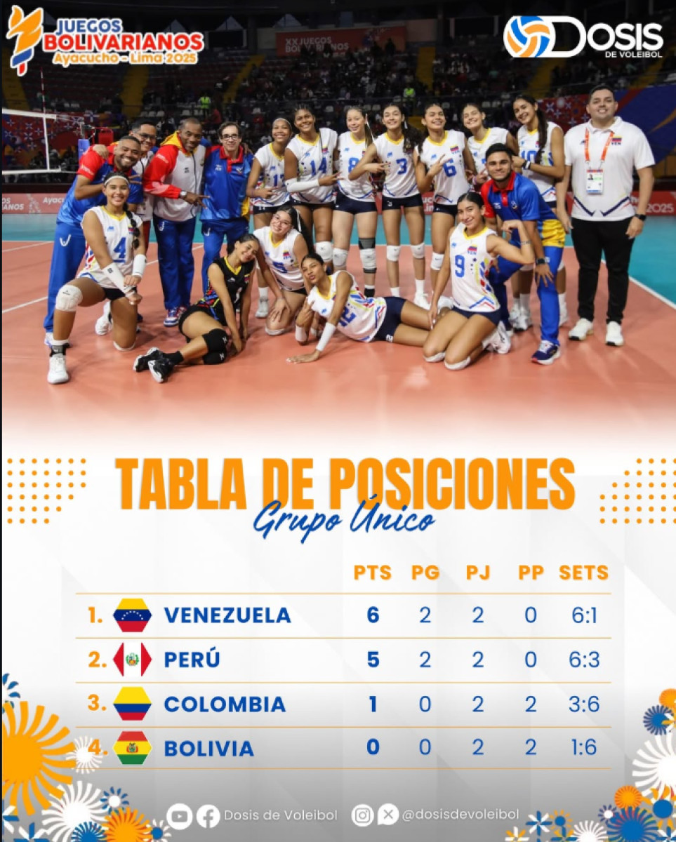 Perú se encuentra en el segundo lugar de la tabla de posiciones en los Juegos Bolivarianos - Vóley. Créditos: Dosis de Voleibol.