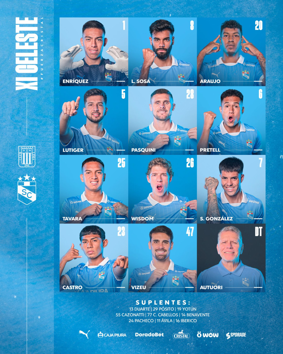 Sporting Cristal: Diego Enríquez; Leandro Sosa, Miguel Araujo, Rafael Lutiger, Nicolás Pasquini; Jesús Pretell, Martín Távara, Ian Wisdom; Santiago González, Maxloren Castro e Irven Ávila.