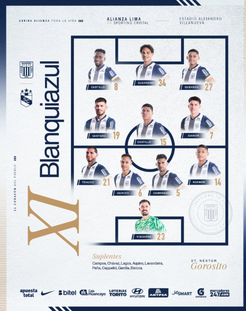 - Alianza Lima: Guillermo Viscarra; Marco Huamán, Carlos Zambrano, Renzo Garcés, Miguel Trauco; Fernando Gaibor, Jesús Castillo, Sergo Peña; Kevin Quevedo, Eryc Castillo y Paolo Guerrero.