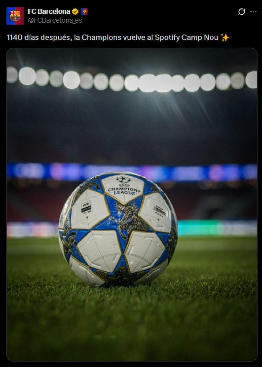 "1140 días después, la Champions vuelve al Spotify Camp Nou", se lee en el post vía X del club blaugrana, quien celebra el regreso de este gran torneo a su mítico estadio.