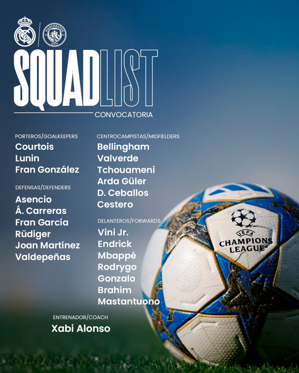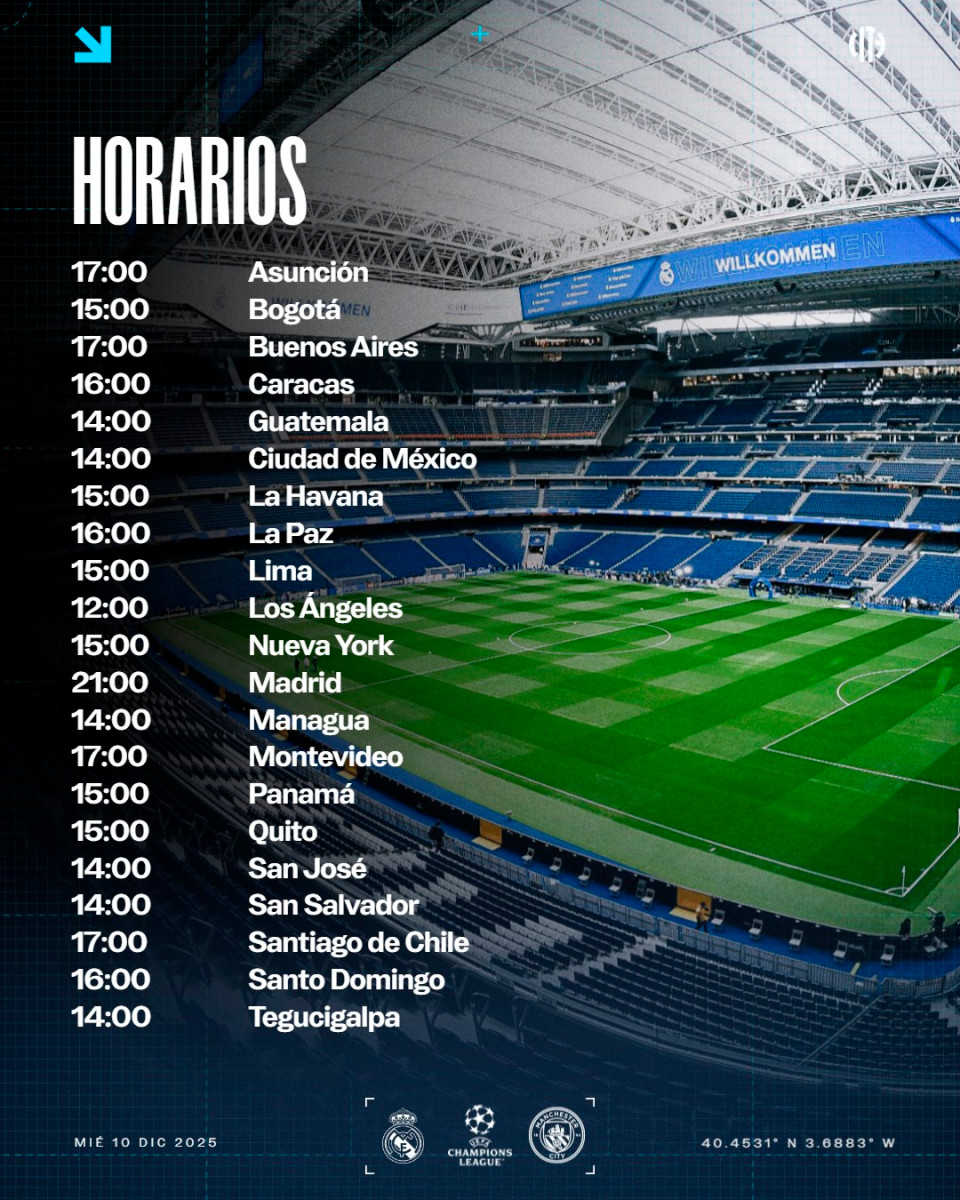 El Real Madrid recibirá al Manchester City en el Estadio Santiago Bernabéu de Madrid, España, en la jornada 6 de la UEFA Champions League 2025-26.