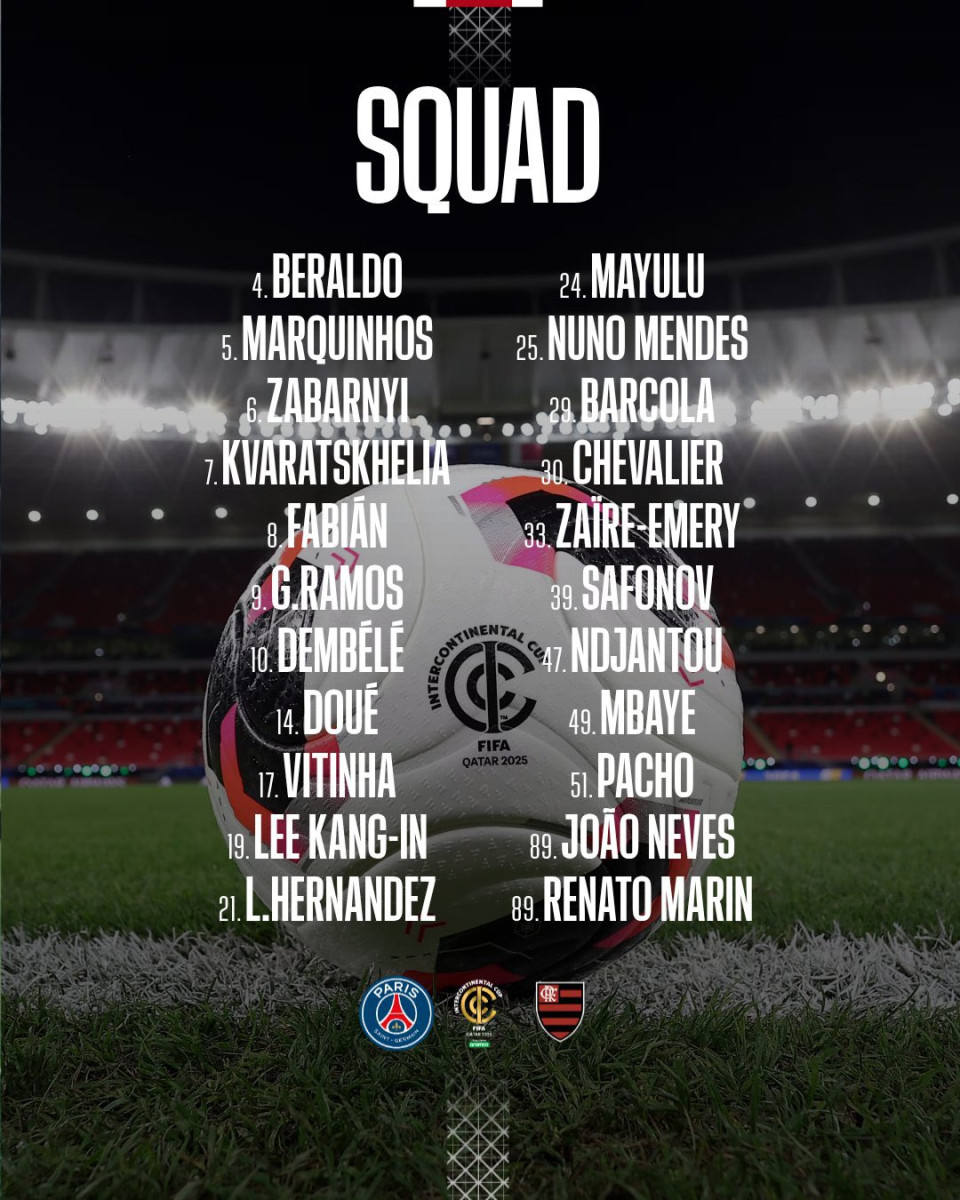 - PSG: Matvey Safonov; Warren Zaire-Emery, Ilya Zabarnyi, Willian Pacho, Nuno Mendes; Fabián Ruiz, Vitinha, Joao Neves; Khvicha Kvaratskhelia, Bradley Barcola y Goncalo Ramos.