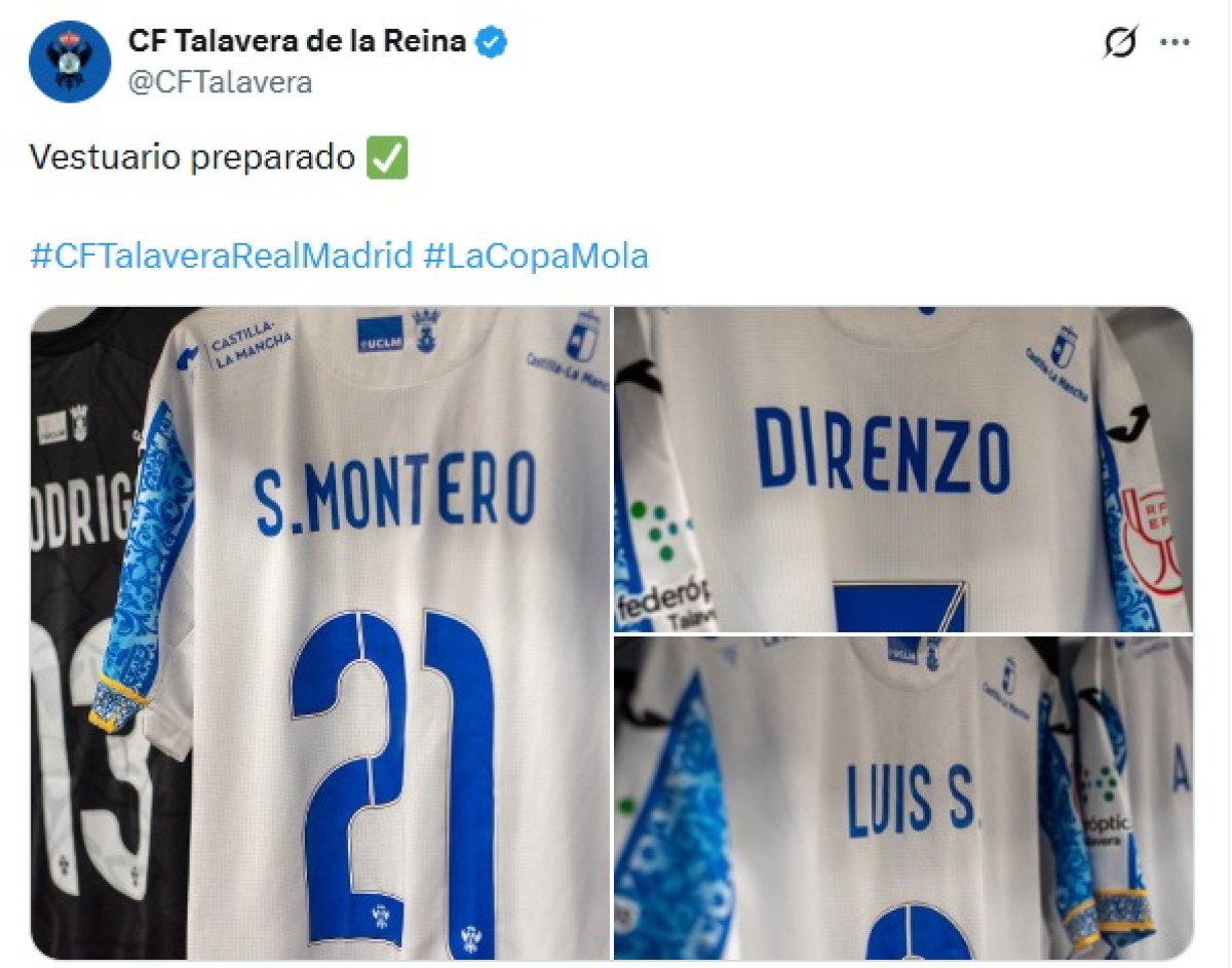 El equipo local ya tiene preparadas en su camerino las camisetas que usará hoy. Foto: captura de CF Talavera de la Reina/X
