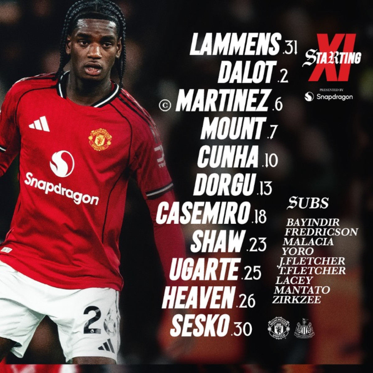 - Manchester United: Lammens, Shaw, Heaven, Yoro, Dorgu, Casemiro, Ugarte, Dalot, Cunha, Mount, Sesko