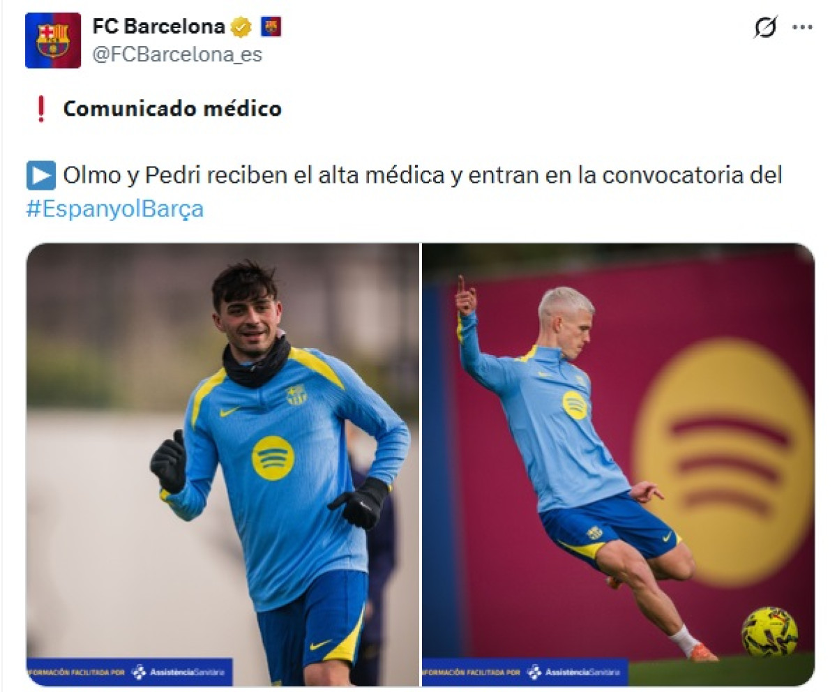 El equipo culé informó que Dani Olmo y Pedri recibieron el alta médica para poder estar presentes en este duelo. Foto: captura de FC Barcelona/X