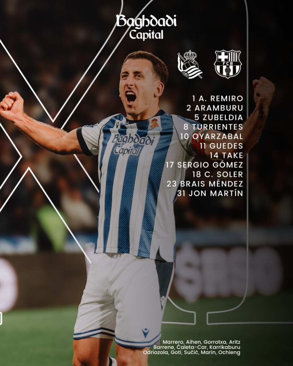 Remiro, Aramburu, Zubeldia, Turrientes, Oyarzabal, Guedes, Take, Sergio Gómez, C. Soler, Brais Méndez, Jon Martín.