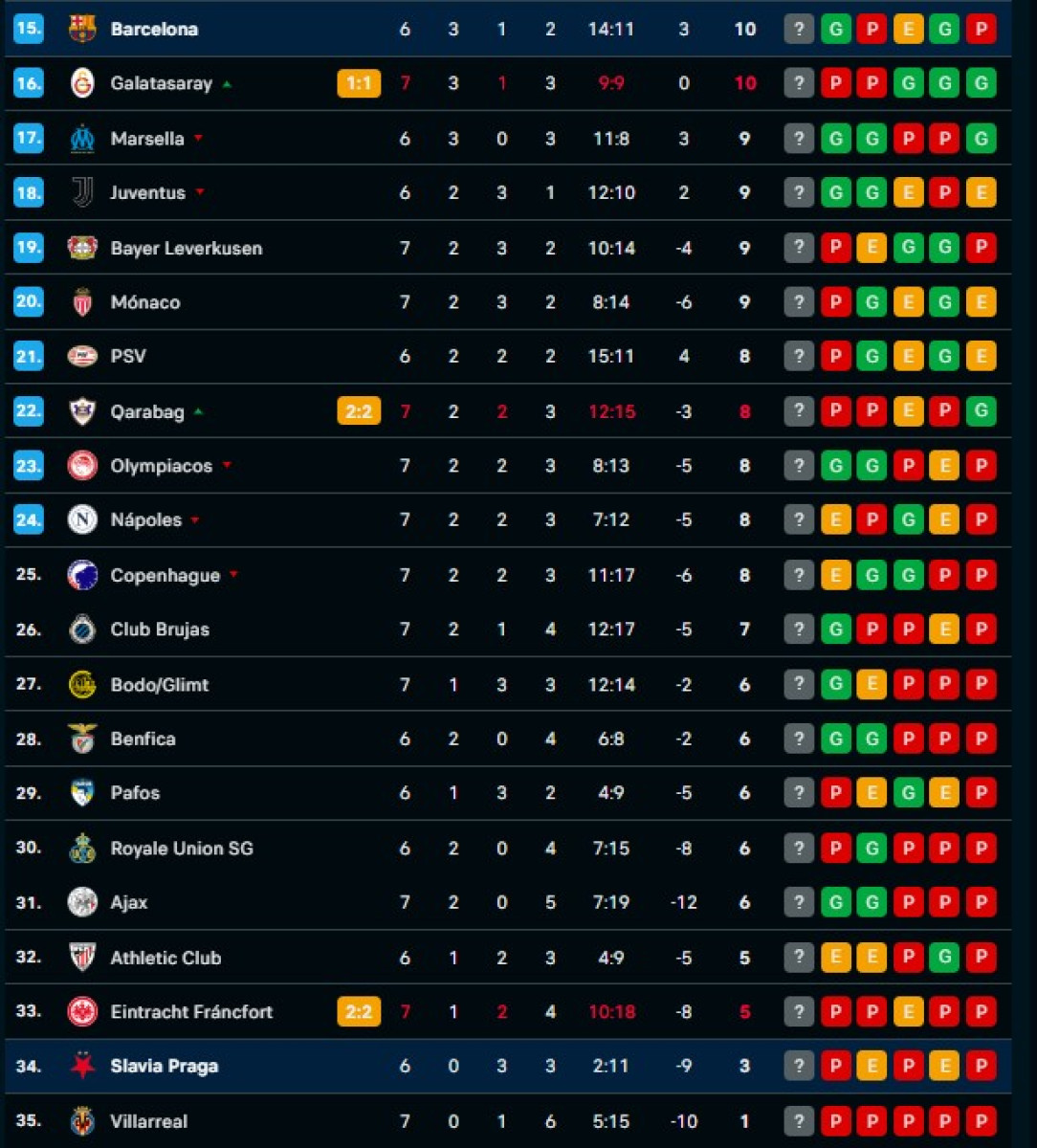 Así se encuentran ambos conjuntos en la tabla de posicones. Por su parte, Barcelona se encuentra en el puesto 15, mientras que el Slavia Praga en el puesto 34.
