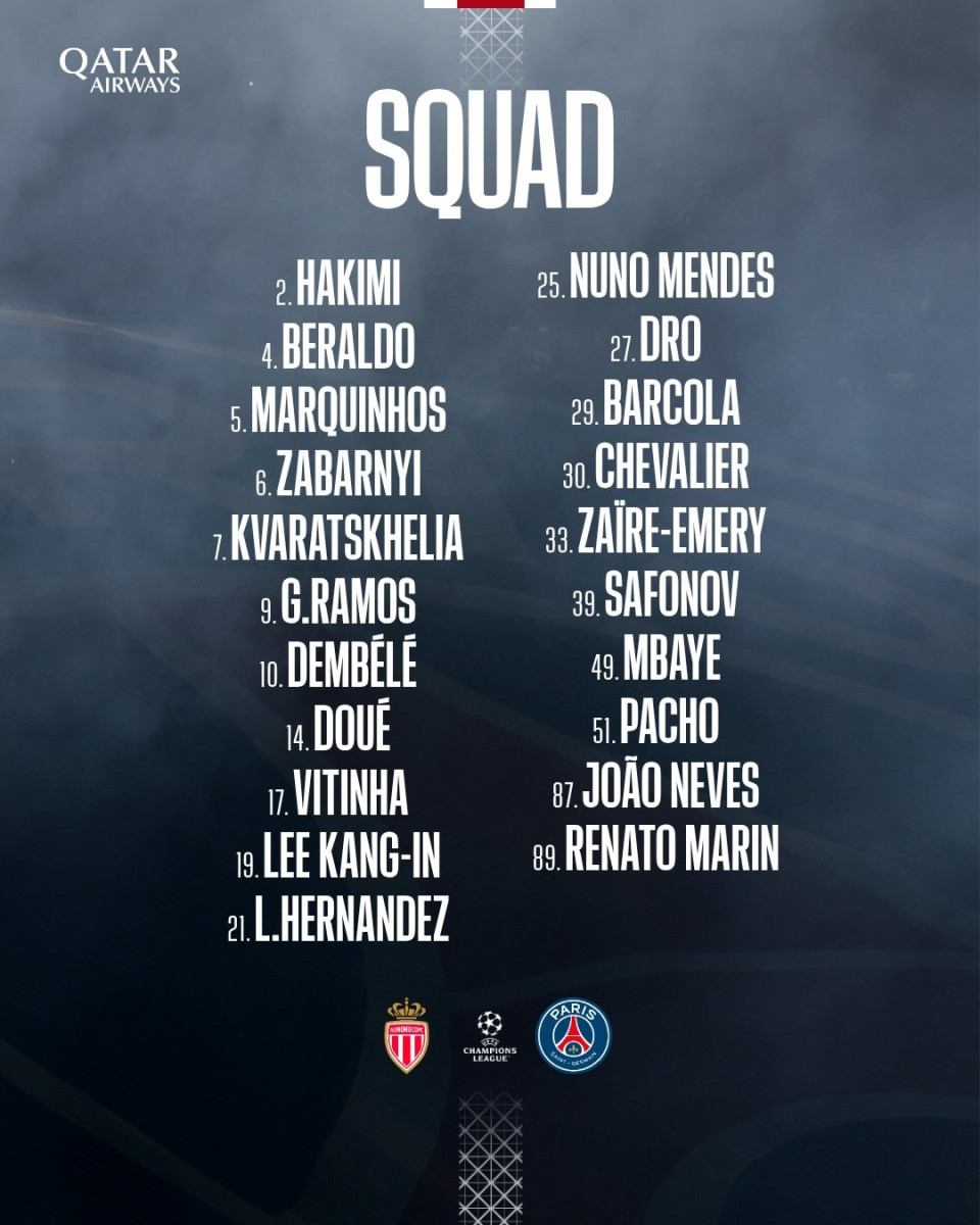 - PSG: Safonov, Mendes, Pacho, Maquinhos, Hakimi, Neves, Vitinha, Zaire- Emery, Kvaratskhelia, Dembélé, Doue.