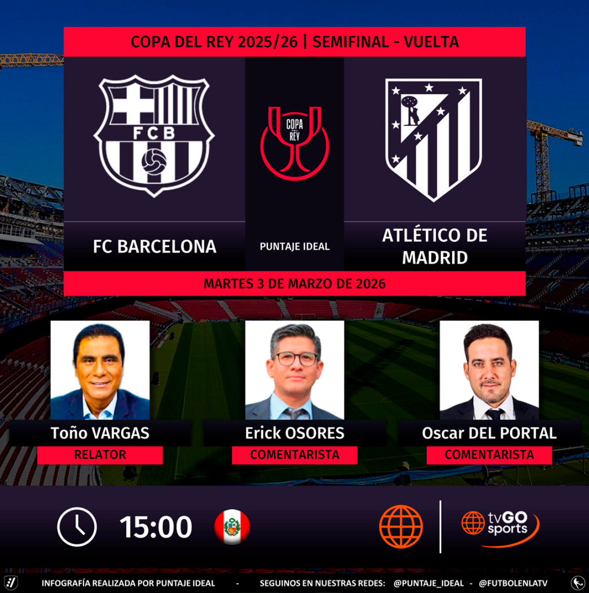 En territorio peruano, la vuelta entre Barcelona y Atlético Madrid se podrá ver desde las 3.00 p. m. Para otros países, consulta la siguiente guía de horarios.