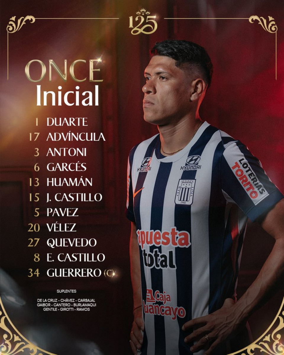 • Alianza Lima: Alejandro Duarte; Luis Advíncula, Renzo Garcés, Mateo Antoni, Marco Huamán; Jesús Castillo, Esteban Pavez, Jairo Vélez; Eryc Castillo, Paolo Guerrero, Kevin Quevedo.