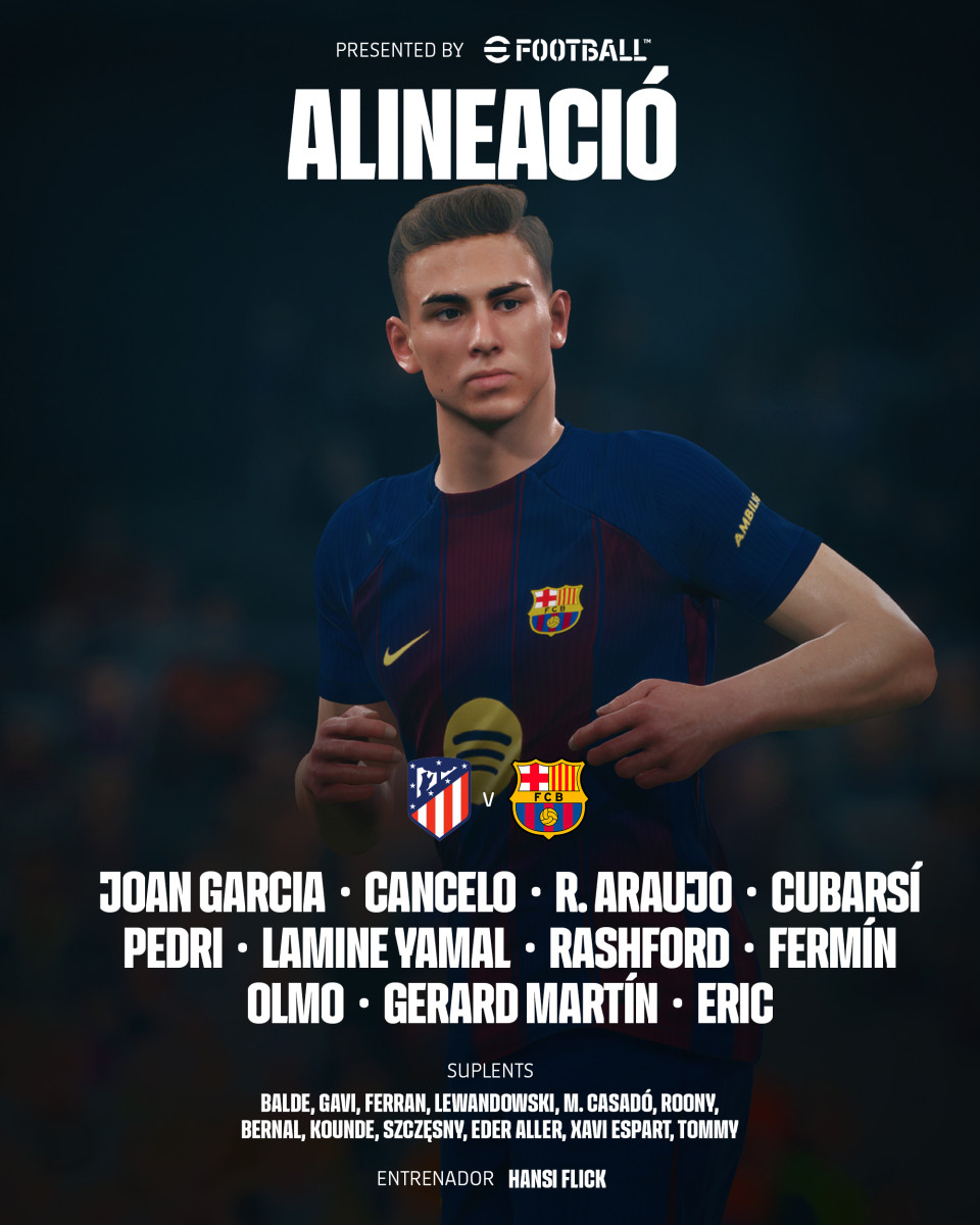 - Barcelona: Joan García; Eric García, Pau Cubarsí, Gerard Martín, Joao Cancelo; Marc Bernal, Pedri; Lamine Yamal, Fermín López, Marcus Rashford y Ferrán Torres.