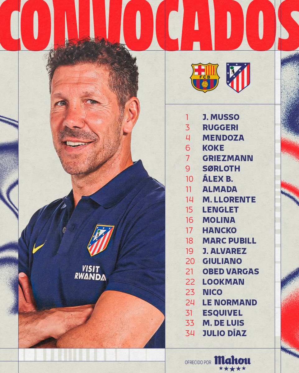 - Atlético Madrid: Jan Oblak, Marc Pubill, Robin Le Normand, Dávid Hanko, Matteo Ruggeri, Marcos Llorente, Koke, Giuliano Simeone, Antoine Griezmann, Ademola Lookman, Julian Álvarez.