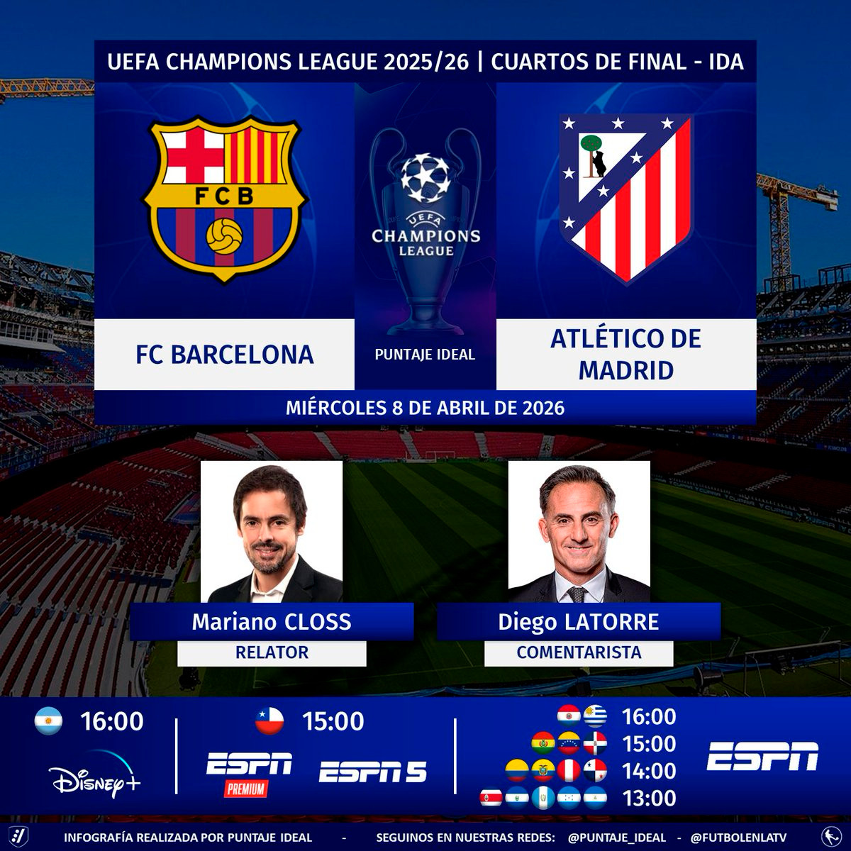 La transmisión de este partido de cuartos de final Champions League estará a cargo de la cadena ESPN en Sudamérica (excepto Argentina y Brasil).
