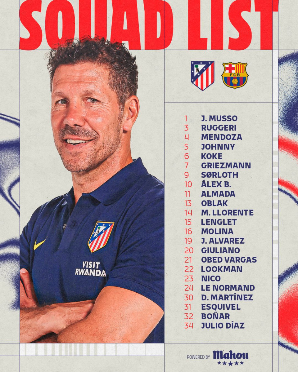 - Atlético Madrid: Jan Oblak; Nahuel Molina, Robin Le Normand, Clément Lenglet, Matteo Ruggeri; Giuliano Simeone, Marcos Llorente, Koke, Ademola Lookman; Antoine Griezmann y Julián Alvarez.
