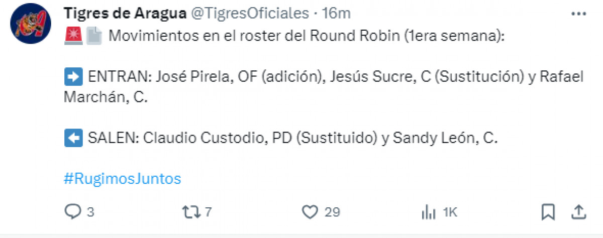 De último minuto, Tigres de Aragua anunciaron un ligero cambio en lo que iba a ser el roster oficial para el Round Robin: