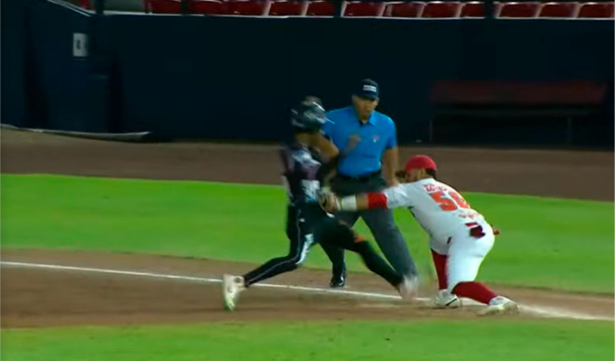 Inmediatamente después, un wild pitch de Roberto Domínguez trae para la goma a Acosta desde tercera base. COC 2-0 PM. Video: RPC