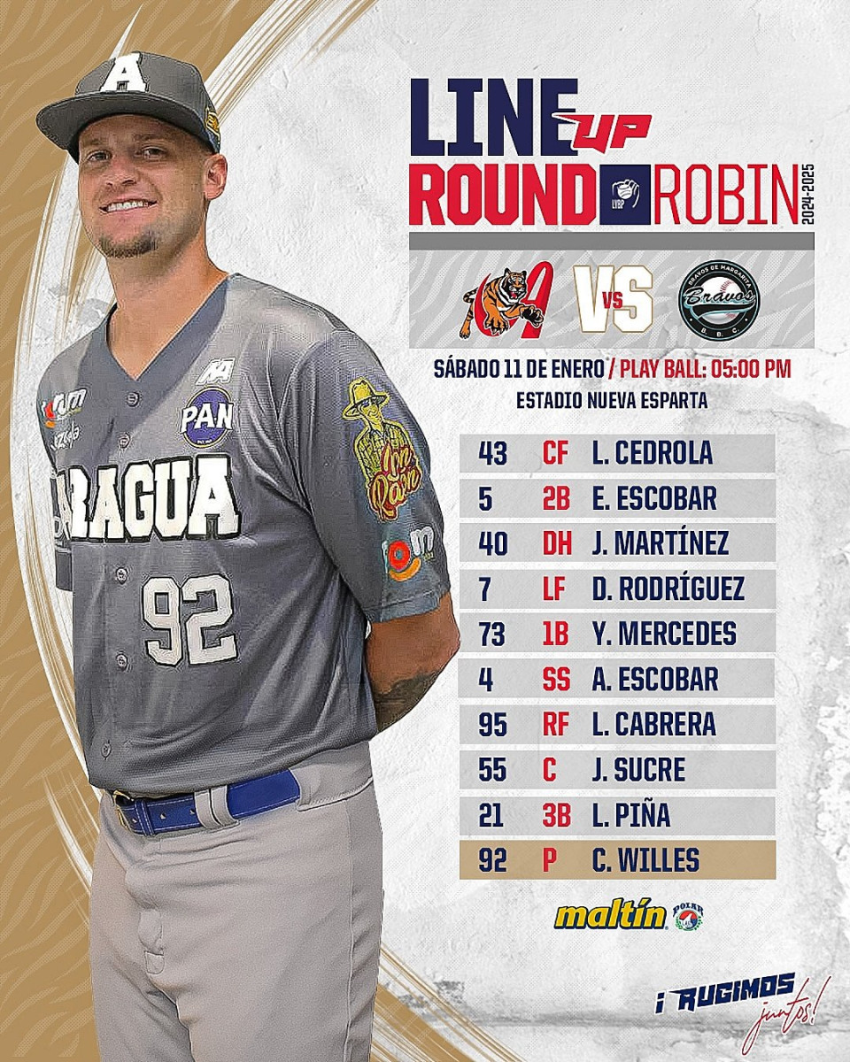 Luego que Bravos tomara ventaja en el primer inning por medio de Alexi Amarista (sencillo remolcador), Tigres remonta el partido a través de los dobles de Alcides Escobar y Jesús Sucre, quienes traen 2 carreras para la goma (alta del segundo). Marcador: ARA 2-1 MAR.
