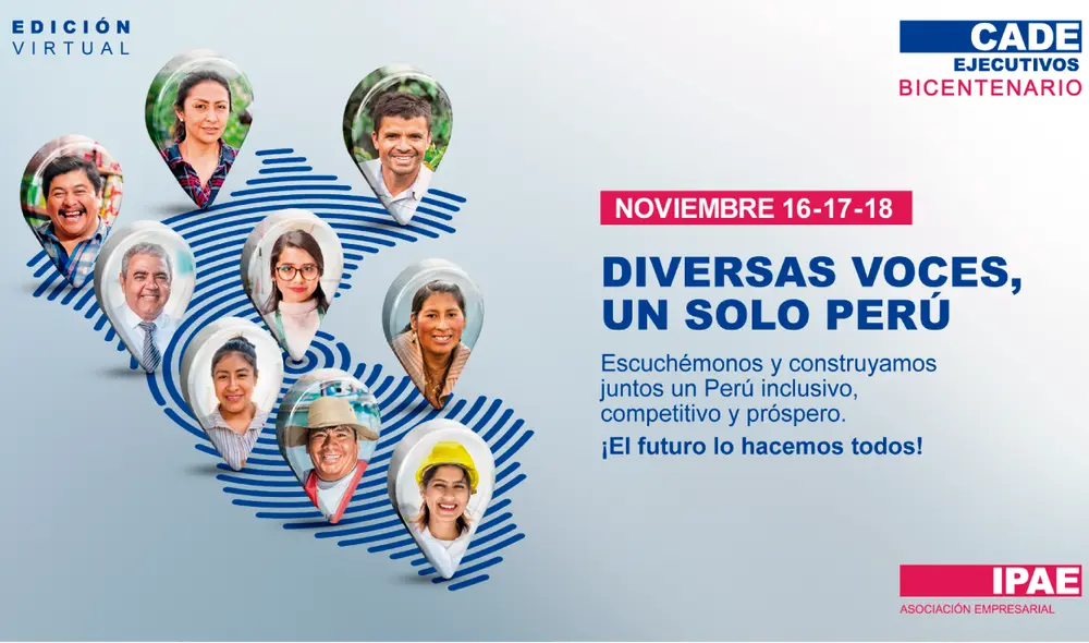 Bajo el lema “Diversas voces, un solo Perú”, el encuentro anual de empresarios más importante a nivel nacional convoca a distintas voces provenientes de las regiones del país. El Comité de este año es presidido por Rosario Bazán, Fundadora y Gerente General de Danper, y la acompañan Rolando Arellano, Presidente de Arellano Consultoría para Crecer; Gonzalo Banda, Analista político y Profesor de la Universidad Católica Santa María; Humberto Correa, Profesor principal de la Universidad de Piura; Mariela García de Fabbri, Gerente General de Ferreycorp; Mariana Rodríguez, Presidenta de CADE Ejecutivos 2020; Felipe Valencia Dongo, Gerente de Desarrollo Empresarial del Grupo Estrategia; Joaquín Valle del Olmo, Director gerente y socio de Boston Consulting Group; Sandro Venturo, Director de Toronja Comunicación Estratégica; Elena Conterno, Presidenta de IPAE Asociación Empresarial y Carlos Gallardo, Gerente de Desarrollo Nacional de IPAE.