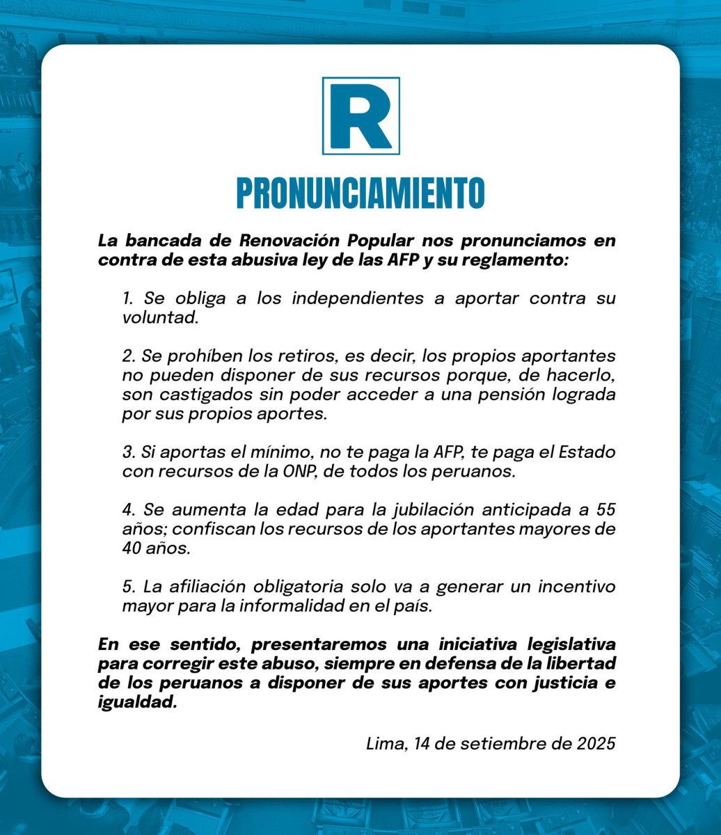 Las bancadas de Alianza para el Progreso y Renovación Popular emitieron pronunciamientos públicos rechazando la Ley de Modernización del Sistema Previsional, y señalaron que limita la libertad de los trabajadores sobre el uso de sus aportes, favorece la informalidad y no garantiza pensiones dignas.