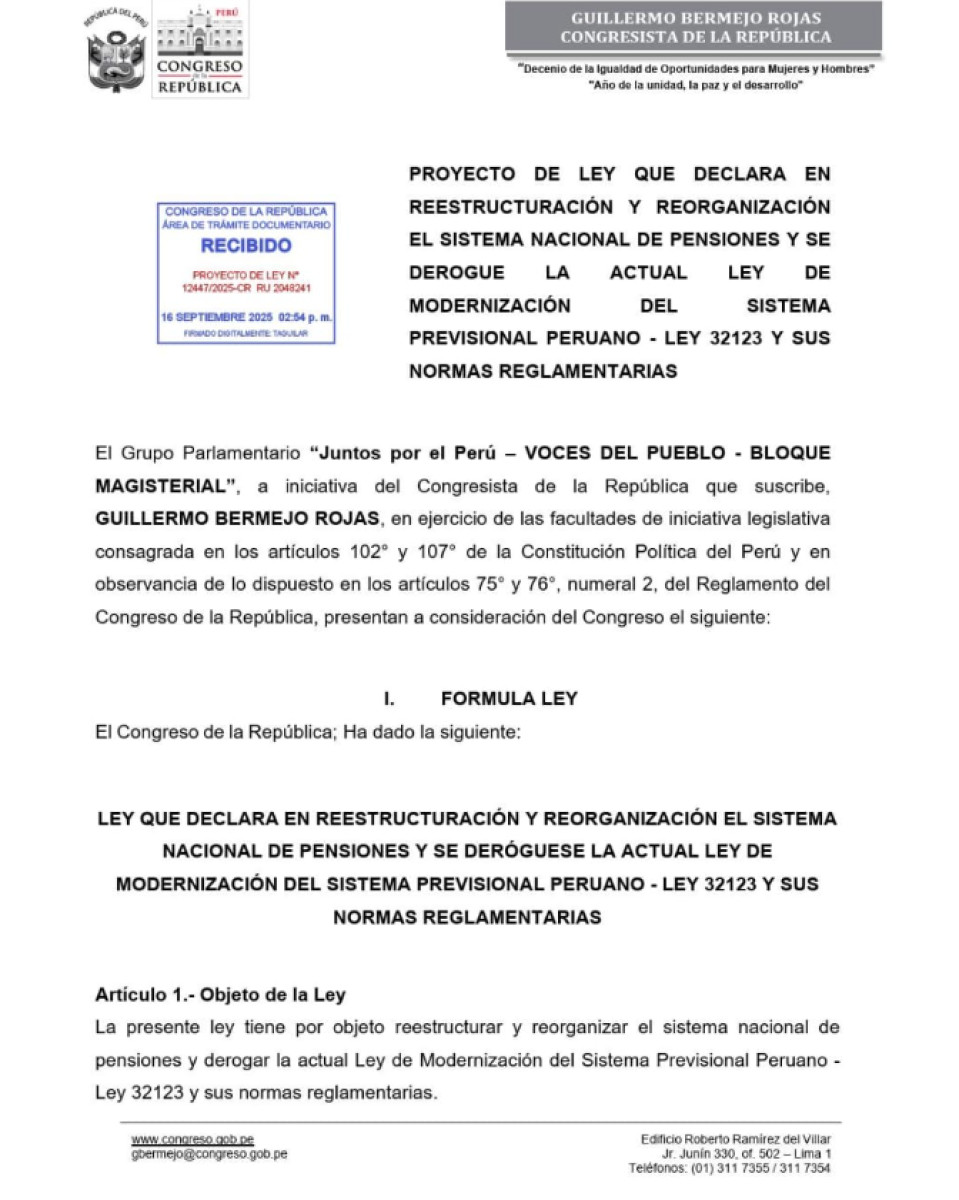 El congressita Bermejo presentó el Proyecto de Ley N° 12447 con el fin de derogar la reforma del sistema previsional aprobada en favor de las AFP. La iniciativa también plantea la reorganización del Sistema Nacional de Pensiones (SNP) y la creación de un modelo que busque garantizar pensiones dignas y universales para los afiliados.