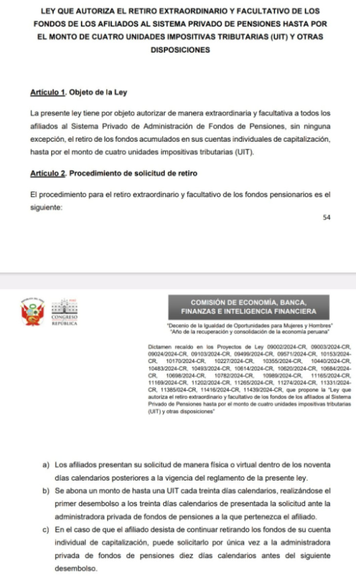 -Debate y votación del Dictamen recaído en el Proyecto de Ley 09002/2024-CR, Proyecto de Ley 09003/2024-CR, Proyecto de Ley 09024/2024-CR, Proyecto de Ley 09103/2024-CR, Proyecto de Ley 09499/2024-CR, Proyecto de Ley 09571/2024-CR, Proyecto de Ley 10153/2024-CR, Proyecto de Ley 10227/2024-CR, Proyecto de Ley 10355/2024-CR, Proyecto de Ley 10440/2024-CR, Proyecto de Ley 10483/2024-CR, Proyecto de Ley 10493/2024-CR, Proyecto de Ley 10614/2024-CR, Proyecto de Ley 10620/2024-CR, Proyecto de Ley 10684/2024-CR, Proyecto de Ley 10698/2024-CR, Proyecto de Ley 10782/2024-CR, Proyecto de Ley 11165/2024-CR, Proyecto de Ley 11169/2024-CR, Proyecto de Ley 11202/2024-CR, Proyecto11265/2024-CR, Proyecto de Ley 11274/2024-CR, Proyecto de Ley 11331/2024-CR, Proyecto de Ley 11385/2024-CR, Proyecto de Ley 11416/2024-CR, Proyecto de Ley 11439/2024-CR, que propone la “Ley que autoriza el retiro extraordinario y facultativo de los fondos de los afiliados al Sistema Privado de Pensiones hasta el monto de cuatro Unidades Impositivas Tributarias (UIT)”.