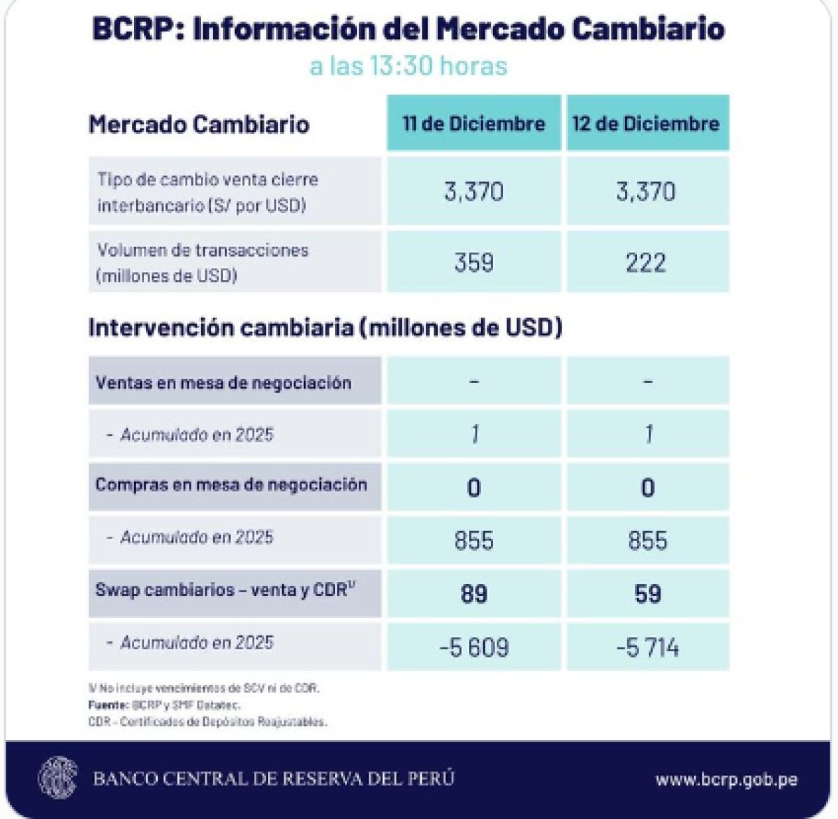 De acuerdo al Banco Central de Reserva del Perú (BCRP), el billete verde cerró su cotización en S/3,370 este 13 de diciembre. Esta cifra se ubica a la par a comparación de la reportada un día antes, la cual estuvo en S/3,370.