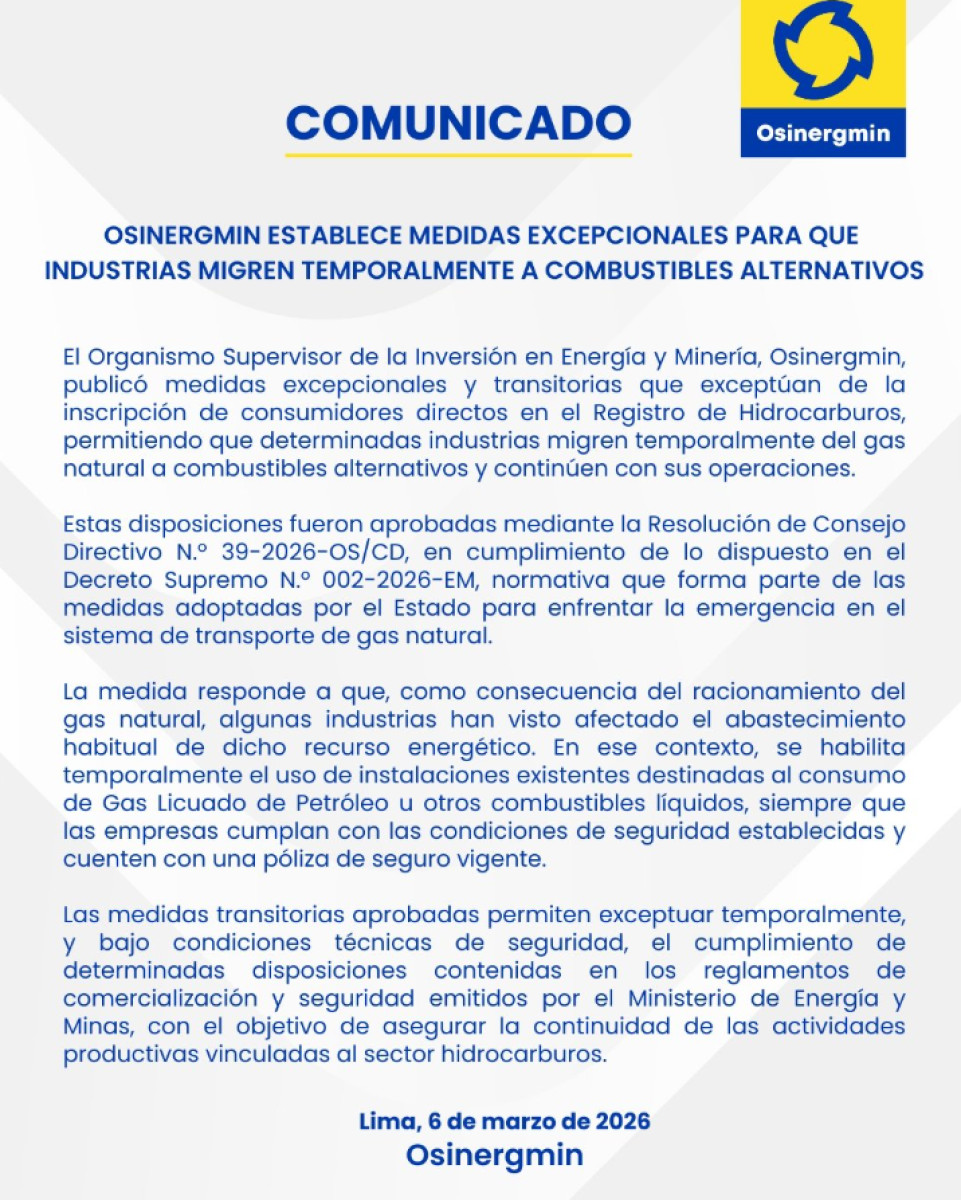 Osinergmin dispuso medidas excepcionales para que determinadas industrias puedan migrar temporalmente del gas natural hacia combustibles alternativos, como Gas Licuado de Petróleo (GLP) u otros combustibles líquidos, con el fin de que continúen con sus operaciones durante la emergencia en el sistema de transporte de gas.