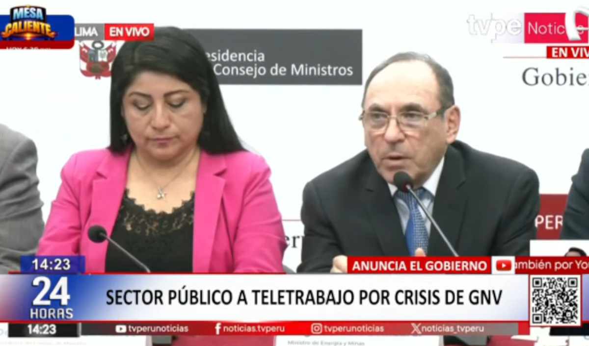 Durante una conferencia de prensa, la presidenta del Consejo de Ministros, Denisse Miralles, informó que el Gobierno aplicará teletrabajo en las entidades públicas de Lima y Callao tras la crisis de abastecimiento de GNV registrada en el país por la rotura del ductor de transporte de gas naturales las instalaciones de la empresa Transportadora de Gas del Perú (TGP). Asimismo, señaló que la medida también será promovida en el sector privado.