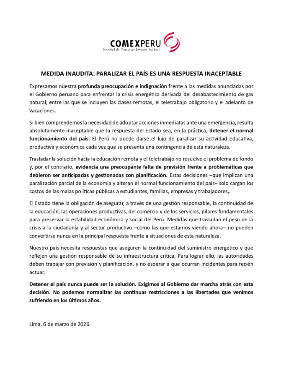 La Sociedad de Comercio Exterior del Perú (ComexPerú) expresó su preocupación frente a las medidas anunciadas por el Gobierno para enfrentar la crisis energética derivada del desabastecimiento de gas natural, entre las que se incluyen clases remotas, teletrabajo obligatorio y adelanto de vacaciones. A través de un comunicado, el gremio sostuvo que estas disposiciones implican, en la práctica, detener el funcionamiento regular de actividades educativas, productivas y económicas del país.