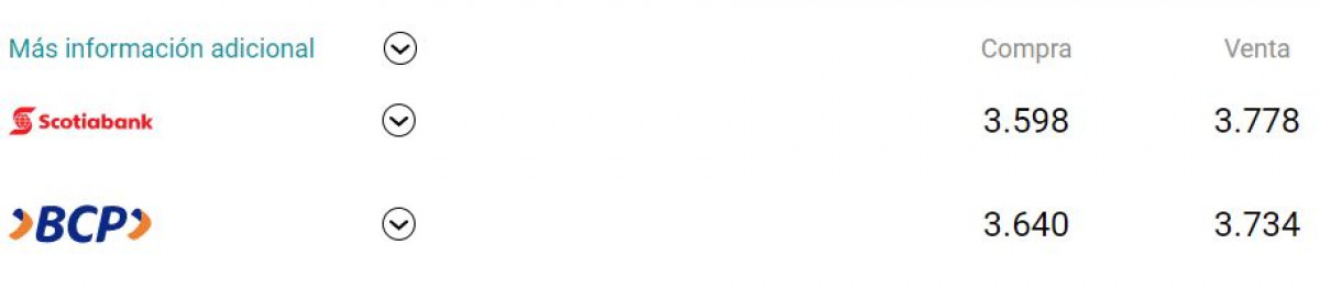 En BCP, el dólar está S/ 3.640 la compra y S/ 3.734 la venta. En Scotiabank, está S/ 3.598 y S/ 3.778, respectivamente.