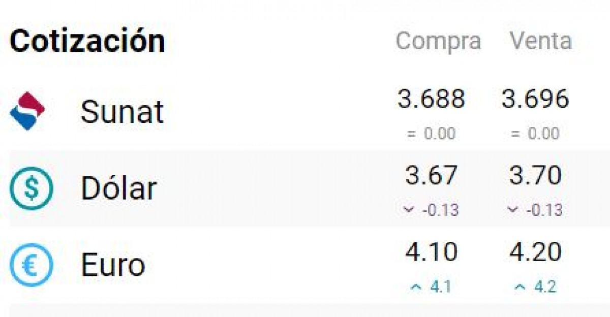 De acuerdo con el portal cuantoestáeldolar.pe, el precio del dólar paralelo en Perú se cotiza en S/3,68 a la compra y S/3,67 la venta. Mientras que el promedio en el mercado bancario se ubica en S/3,60 a la compra y S/3,79 a la venta.