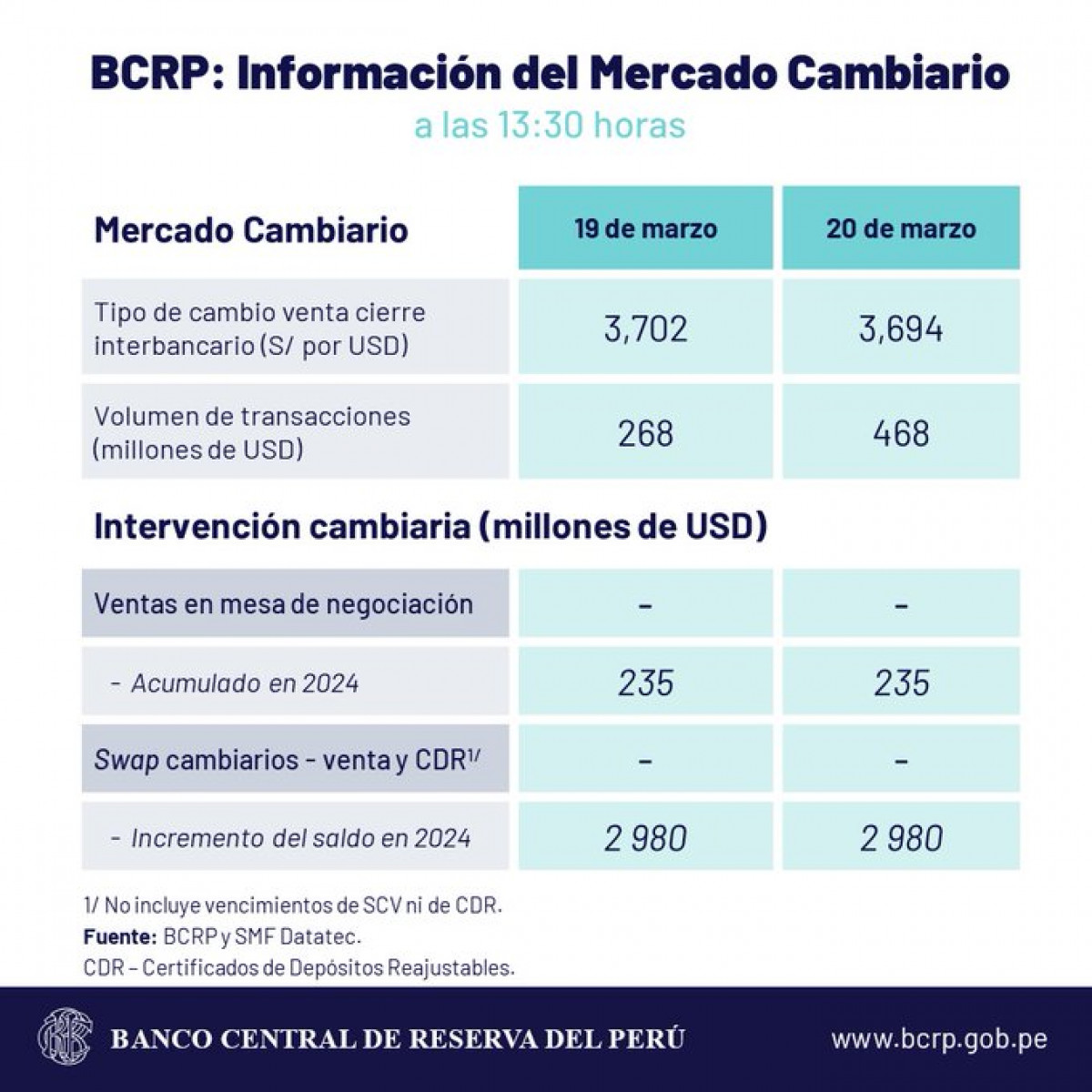 El tipo de cambio del dólar cerró nuevamente a la baja y se ubicó en S/3,6940 este miércoles 20 de marzo, de acuerdo al Banco Central de Reserva del Perú (BCRP).