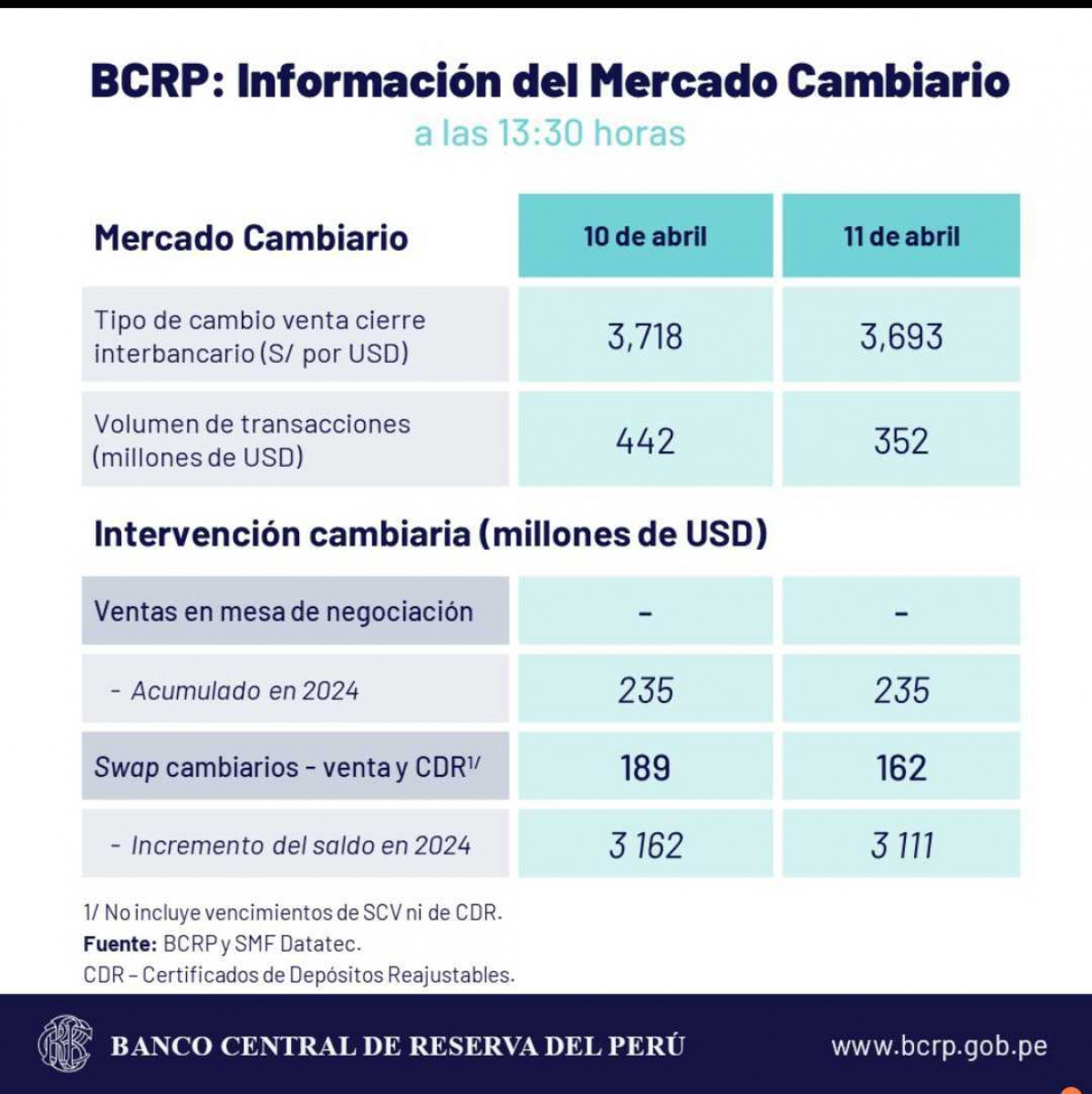 De acuerdo con el BCRP. el tipo de cambio del dólar cerró hoy, jueves 11 de abril, en S/3,6930.