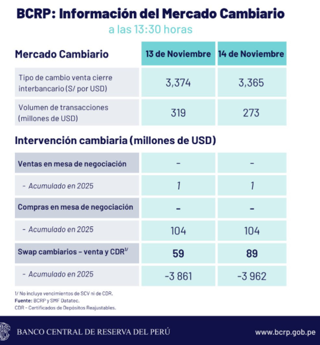 Cierre del tipo de cambio, según BCRP HOY, 14 de noviembre