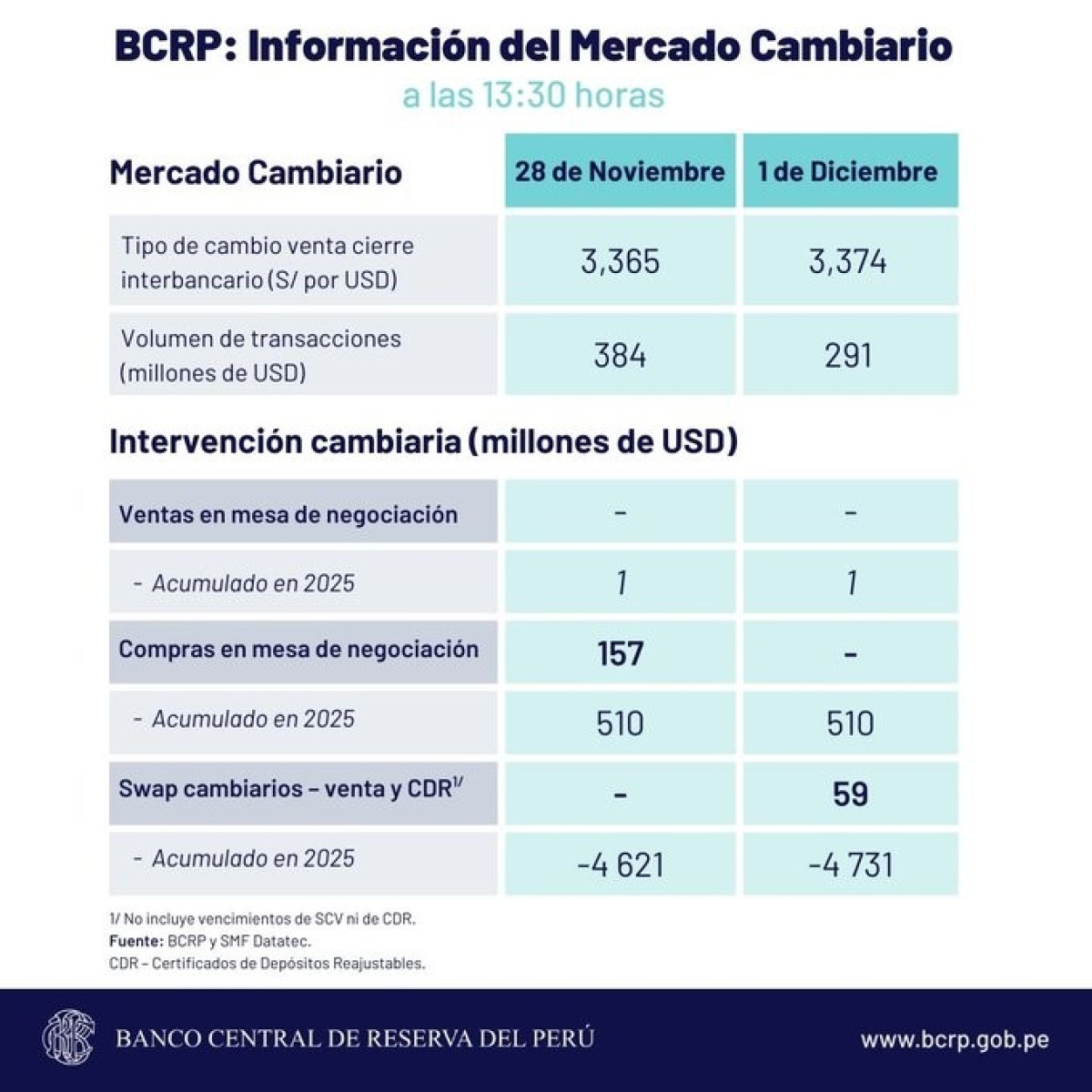 Cierre del tipo de cambio, según BCRP HOY, 2 de diciembre