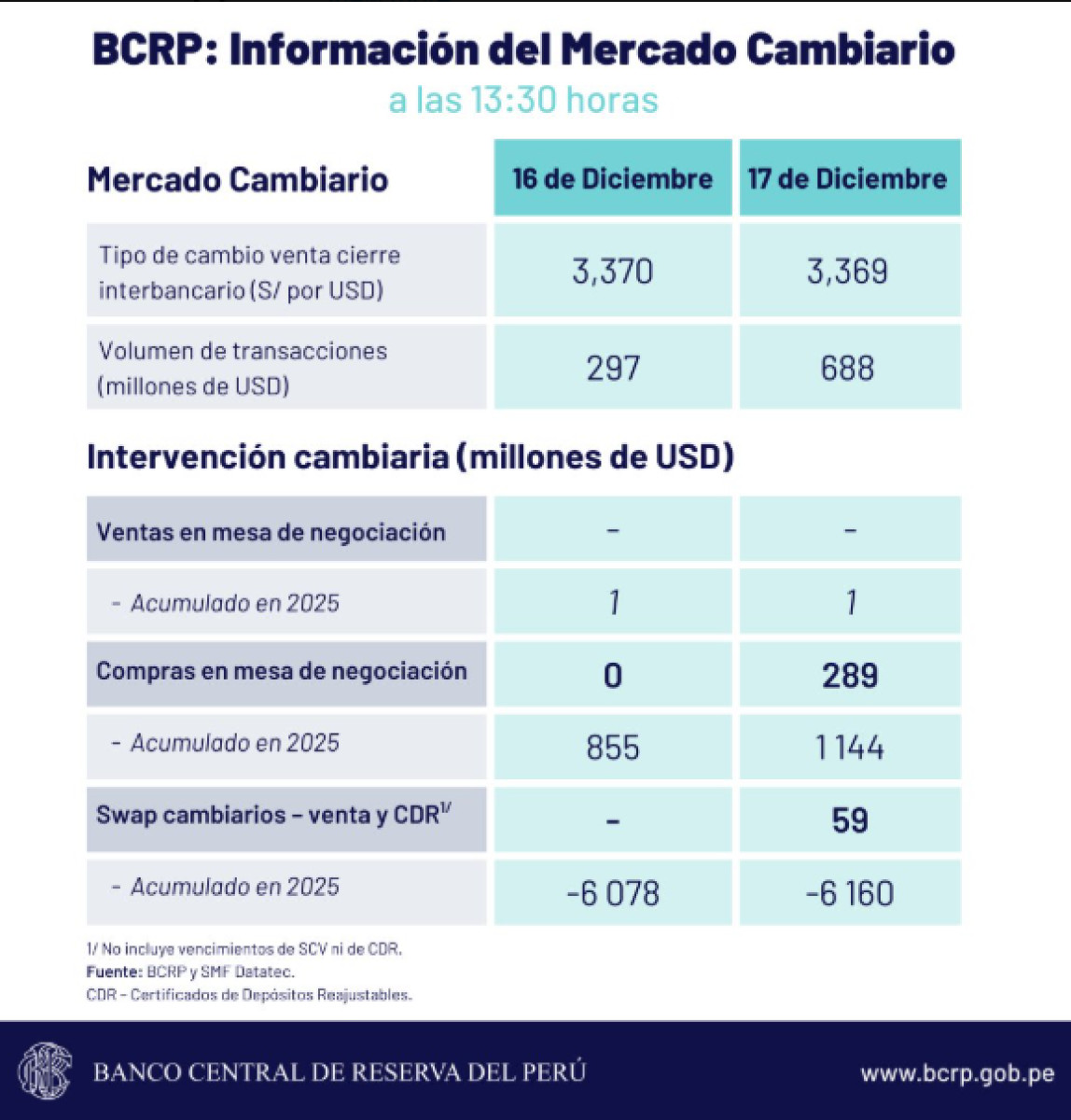 De acuerdo al Banco Central de Reserva del Perú (BCRP), el billete verde cerró su cotización en S/3,369 este 17 de diciembre. Esta cifra se ubica a la baja a comparación de la reportada un día antes, la cual estuvo en S/3,370.