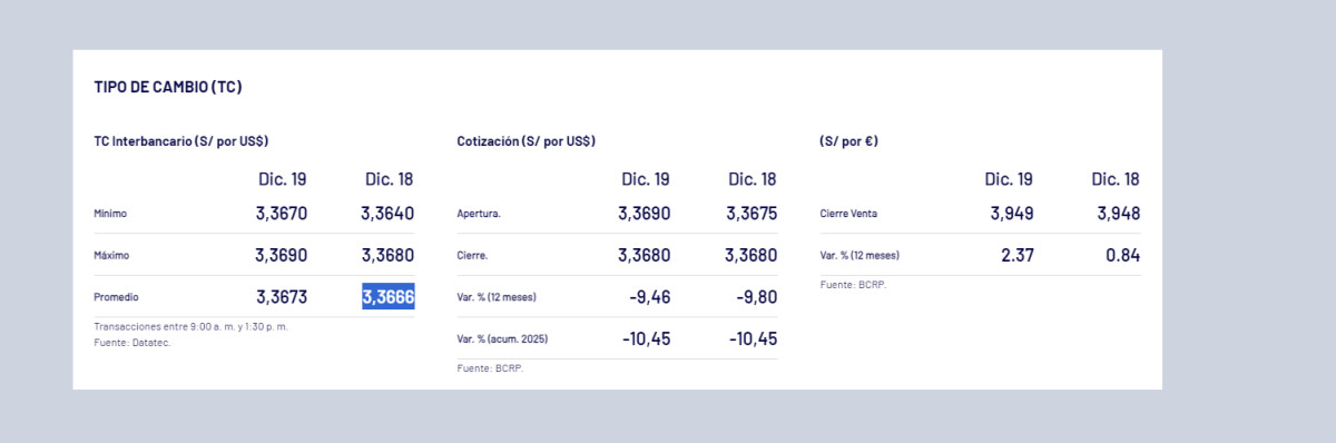 Cierre del tipo de cambio, según BCRP HOY, 20 de diciembre