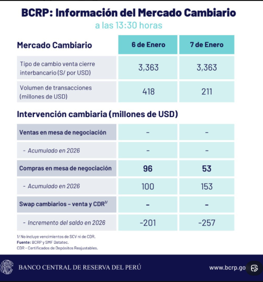 Cierre del tipo de cambio, según BCRP HOY, 7 de enero