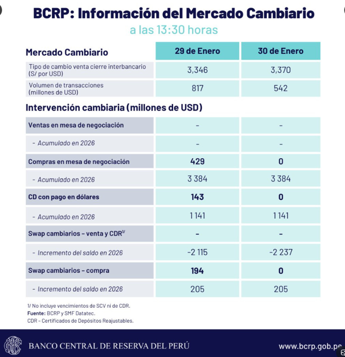 Cierre del tipo de cambio, según BCRP HOY, 30 de enero