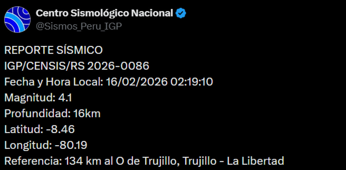 Un sismo de magnitud 4,1 se registró a las 02:19 a. m. a 134 kilómetros al oeste de Trujillo, Trujillo - La Libertad. El temblor del lunes 16 de febrero de 2026, se registró a una profundidad de 16 kilómetros, según informó el Instituto Geofísico del Perú (IGP) vía X. Recuerda tener siempre lista una mochila de emergencia para estar preparado ante un desastre natural.