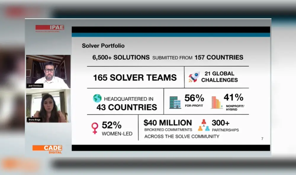 Como ejemplo, Bruna Braga contó sobre los talleres de Solveathon – que son Hackathones organizadas por el MIT Solve. En el Perú se han realizado dos, en el marco de #CADEdigital: 1) Solveathon “Soluciones sostenibles para enfrentar el déficit hídrico”, y es presentada y auspiciada por el Grupo Cierro Prieto. y 2) Desafío digital para la reactivación económica”, la presenta la Secretaria de Gobierno Digital de la Presidencia de Consejo de Ministros (PCM) y la auspicia Universidad Peruano Alemana (UPAL).