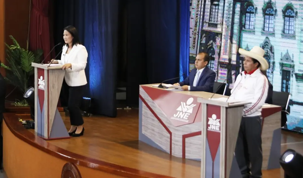 El candidato presidencial de Perú Libre, Pedro Castillo y su contrincante, la lideresa de Fuerza Popular Keiko Fujimori estuvieron frente a frente en el debate presidencial del Jurado Nacional de Elecciones (JNE) este domingo 30 de mayo, en el Aula Magna Simón Bolívar de la Universidad Nacional San Agustín (UNSA) en Arequipa.