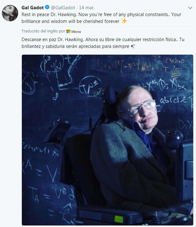 Twitter: Gal Gadot indigna con mensaje tras muerte de Stephen Hawking