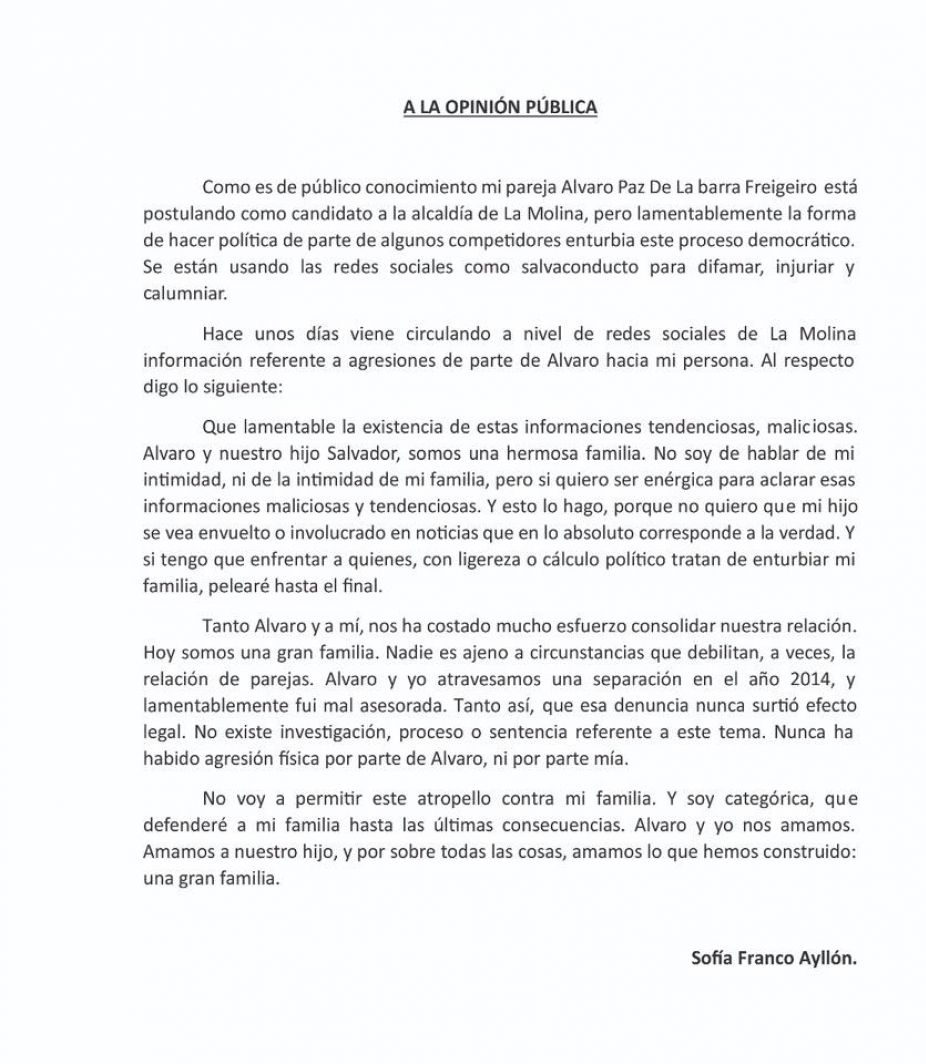 Sofía Franco aclara tema de violencia física por parte de su esposo Álvaro Paz de la Barra