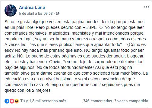 Andrea Luna olvida ataques por desnudo en afiche y se pronuncia en Facebook