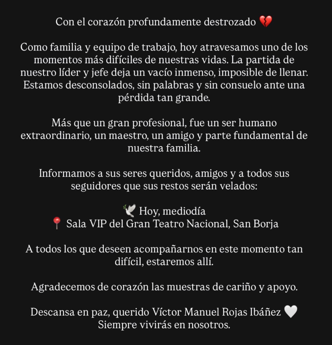Mediante un comunicado posteado en las redes sociales de Manolo Rojas, la familia del cómico dejó un sensible mensaje. En conjunto con su equipo de trabajo, hicieron un llamado a todos los que deseen darle el último adiós al humorista a hacerse presente en el Gran Teatro Nacional.